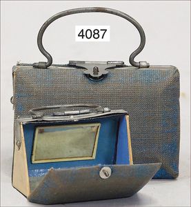 hölzener Trousseau, mit Druckverschluss, 10 cm breit, 5 cm hoch, seitl. an den Rändern vereinzelte Stellen weggebrochen, innen blaue Seide, mit ausgefallener silberner Trinkflasche, Hinter- u. Vorderseite mit Perlmuteinlegeplättchen, 4 cm, 1 Erhard & Söhne Klapp-Bilderalbum, schönes Beistellwerk