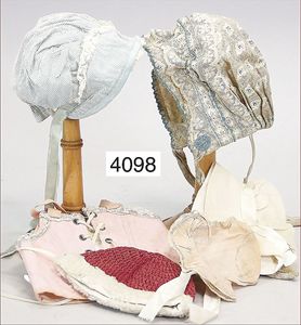 Konv. Häubchen u. Mieder, 1 x frühes Häubchen, schöner orig.-Zust., blau/beige, mit Spitze, für mittelgr. Puppe geeignet, 14 cm breit, 1 x hellblaues Häubchen, mit Spitze- u. Seidenbesatz, Durchm. 10 cm, Mieder, zartrosa, Breite 14 cm, Höhe 12 cm, für mittelgr. Bebe geeignet, schönes Konv.