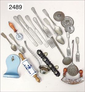 Konv. Puppenküchen-Ausschmückungsteile, Nudelrolle, blau/weiß, Porzellan, 10 cm, Wiegemesser, Teigrad, Besteckteile, Kleinteile