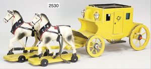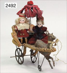 Kutsche mit Rentier, Blech u. Bastteile, 10 cm, 2 Ganzbiskuit-Puppen