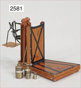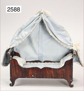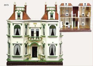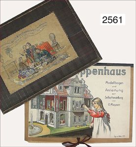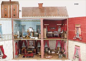 gr. Puppenhaus, ca. 97 cm hoch, 98 cm breit (ohne den kl. Balkon gerechnet), außen Tapete stärker verschlissen, innen sehr schöne Orig.-Tapete an Wand u. Boden, Orig.-Vorhänge, möbliert, mit Zubehör, einige Teile zusätzlich zum restaurieren, um 1900