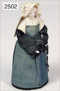 Nadelkissen, Nonne, Biskuit-Brustblattkopf, Stoffkörper, Biskuit-Unterarme, 18 cm