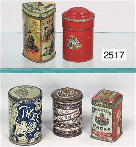 Konv. Ausschmückungsteile für Kaufladen, 5 Blechdosen, eckige Kakaodose, Blech lithogr., runde Teedose, 1 x Benzdorf Dose mit Knauf, 1 x 3-eckige japanische Dose, 6 cm hoch