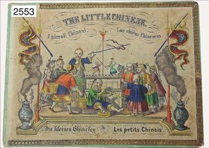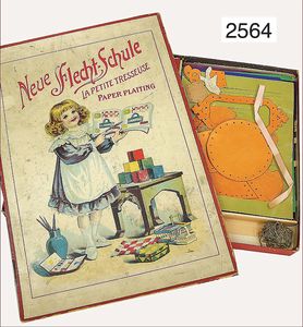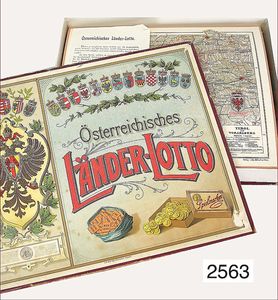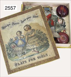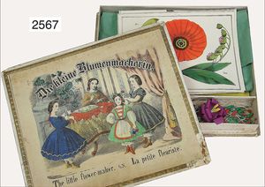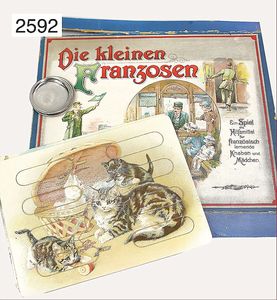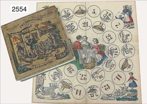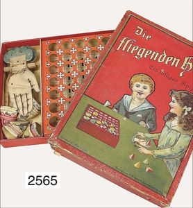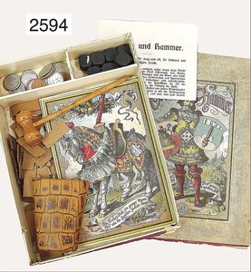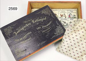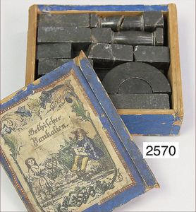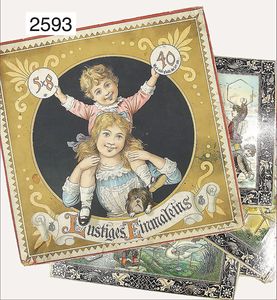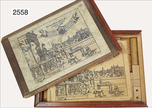 Würfellegespiel, um 1900, Orig.-Holzkiste mit bunt lithogr. Deckbild, 40 x 32 cm