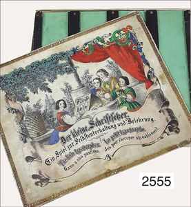 Puppenstubenschule, Frankreich, Automat, 39 cm breit, 30 cm hoch, Lehrerin mit Pult, Musikspielwerk mit Bewegung, Puppe dreht den Kopf u. hebt die Arme, 5 Puppenstubenpuppen, Schüler, Zubehör, Orig.-Holzkiste zum Aufklappen