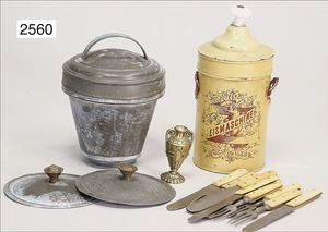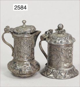 Konv. Ausschmückungsteile für frühe Küche, 4 Silberkrüge, dazu 1 Messbecher Aufschrift „1 Liter“, gemarkt W.G., 1 Milchkanne, Höhe der Becher 3,5 cm, Durchm. 3 cm