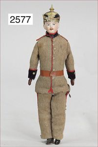 Puppenstubenpuppe, Hausmädchen, Biskuitporzellan-Brustblattkopf, ausmodellierte braune Hochsteckfrisur, blaue gemalte Augen, Biskuit-Unterarme u. –Beine, ausmodellierte Schuhe u. Strümpfe, Stoffkörper, alte Kleidung, 13 cm