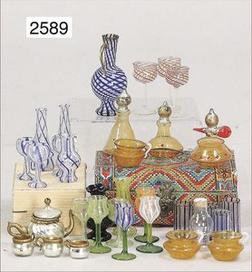Ausschmückungsteile für Stube, 3 untersch. Teppiche, 1 x Seide verschlissen, dazu Messing/Blech vergoldete Hängelampe, rund, Durchm. 7 cm, dazu 1 Messing/blech vergoldetes Nadelkissen, 6 cm hoch, 1 aufwendig gearbeitetes Parfümflacon, Glas