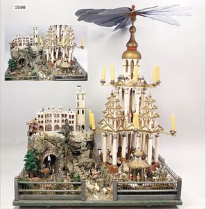 2-tlg. herrschaftl. Puppenstube, mit seitl. Erker, 97 cm breit, 38 cm hoch, die Breite gerechnet ohne Erker, Durchgangstür vertäfelt, Boden mit Intarsien-Einlegearbeit, hochwertig möbliert, reichh. Zubehör, Messing/Blech vergoldet, Leuchter, Schirmständer, einige Zinnteile, mit Puppenstubenpuppen