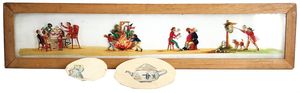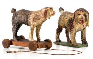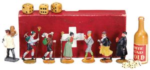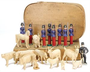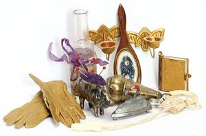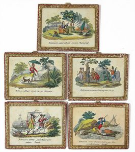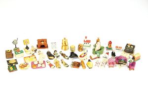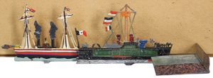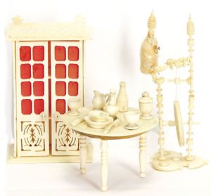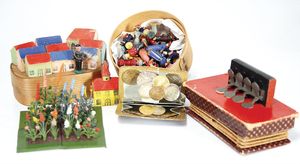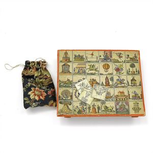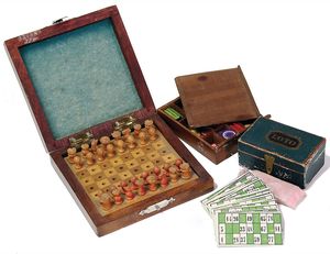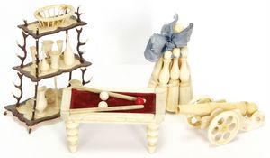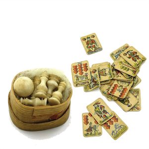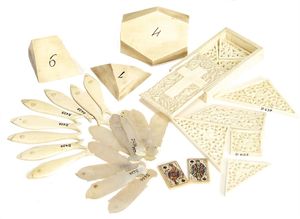 Konv. Spiele, 1 x Jetons Fische, um 1860, 13 x 51 x 2 mm, Bein, 8 Teile, sehr guter Zust., leicht bespielt, 1 x Geschicklichkeitsspiel, 1820 – 1840, 33 x 50 x 37 mm, Bein, 3 Teile, sehr guter Zust., leicht bespielt, 2 Jasskarten, um 1880, guter Zust., leicht bespielt, 1 x Jetons Fische, um 1880, 15 x 48 x 1 mm, Perlmutt, 10 Teile, guter Zust., bespielt, einige Fische leicht verformt, 1 x Tangram in Siebenbrett, um 1880, 12 x 65 x 36 mm, 13 Teile, sehr guter Zust.