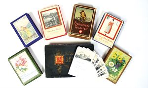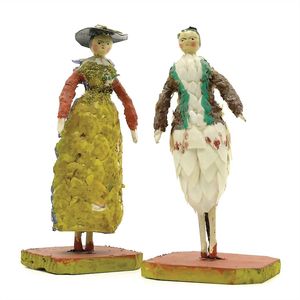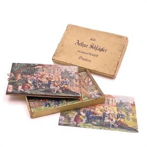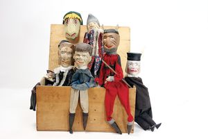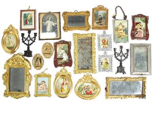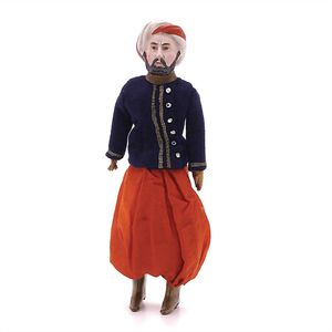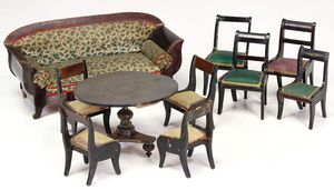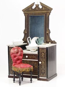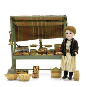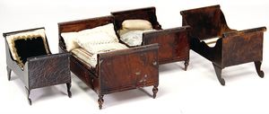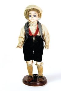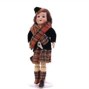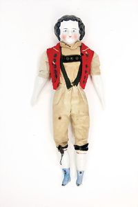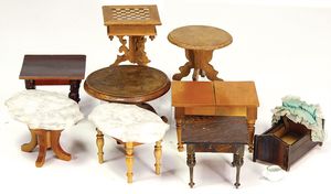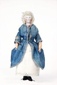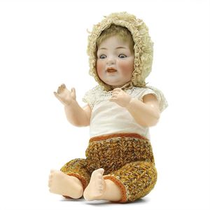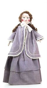 Konv. Stubenpuppen, 1x "Little Woman", gem. "S & H / 1160", "10/0", ab 1894, 14 cm, Biskuitporzellan (Brustkopf, Unterarme und Unterbeine), Glasaugen, bespielt, 1x Dame, gem. "699 / 11/0", 1920 – 1925, 15 cm, Biskuitporzellan (Brustkopf und Unterglieder), 1x Badepuppe (Miniatur), 1890 – 1900, 4,5 cm, glasiertes Porzellan, 1x gem. "7", 1890 – 1900, 17,5 cm, Biskuitporzellan -Kopf, -Unterarme und -Beine, Nesselstoff, 1 Puppenkopf, um 1890, Biskuitporzellan, alles guter - sehr guter Zust., bespielt