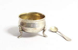 kleines Gewürzschälchen um 1910, Silber 800/000, Punze: Auerhan, innen feuervergoldet, kl. 800/000 original Löffel