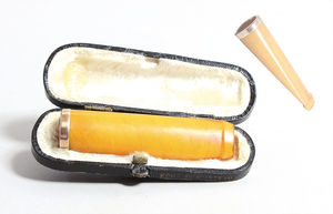 Zigarrenspitze Anfang 20.Jhd., Bernstein "BUTTERSCOTCH", verg. Endkappe, L = 65,2 mm, total 8,3 g, Originalschatulle mit Aufdruck: ECHT BERNSTEIN