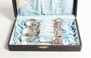 7 kl. Mocca-Löffel, Silber 800/000, emaillierte Stadtwappen: Hamburg, Berlin, Insel Mainau, Königssee, Karlsruhe, Neumünster, Appenzell, in Schatulle