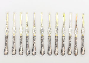 12 Krebsgabeln um 1900, WILHELM BINDER, Silber 800/000, Vorderteil teilweise feuervergoldet und mit feiner Ätzgravur verziert, L = 20,5 cm