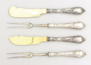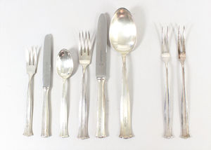 Essbesteck für 8 Personen, Amerika Anfang 20. Jhd., GORHAM, Sterlingsilber, je 8 Gabeln, Messer u. Löffel 17,2 - 23,5 cm; 16 Kaffeelöffel L = 15 cm; 8 Kuchengabeln, L = 16,3 cm, 3 Vorlegelöffel, L = 21,5 cm; 1 Vorleger durchbrochen, L = 21,5 cm; 1 Buttermesser, L = 16,7 cm, kl Gabel, L = 14,5 cm; 1 Kuchenheber, L = 27 cm, total ca.1,9 kg (ohne Messer)