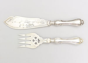 Fischvorlegebesteck um 1900, Silber 800/000, Klinge und Zinken teilweise feuervergoldet und mit feiner Ätzgravur verziert, L = 26 - 28,5 cm, Griffe mit Druckstellen