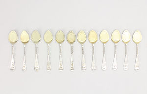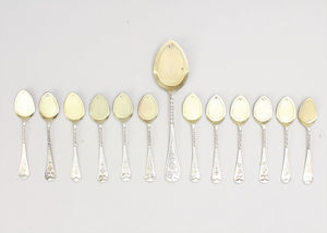 12 Eislöffel ENGLAND Sheffild, E.P.N.S. plated, Laffel vergoldet, L = 12,5 cm; Eisheber, Sheffild, E.P.N.S. plated, Laffel vergoldet, L = 19,5 cm