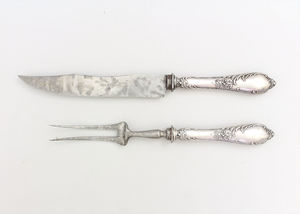 Obstbesteck, CBS, Versilb. 90; je 3 Messer u. Gabeln mit zartem Perlrand, L = 16,8 u. 14,5 cm, Monogramm: H E