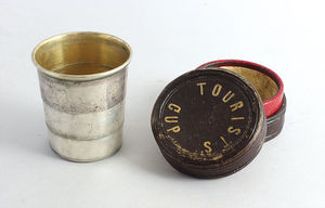 Ausziehbecher England um 1900, Metall innen vergolde, original Lederschatulle innen mit Velour ausgekleidet, Aufdruck: "TURIST CUP"t, D = ca. 42 - 50 mm, H = 59 mm