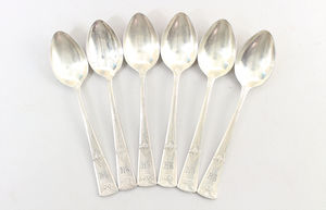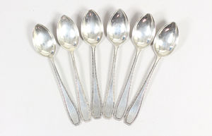 6 Kaffeelöffel JUGENDSTIL um 1900, WMF N, I/0, Entwurf ALBERT MAYER, versilbert, Monog: HB, L = 13,5 cm
