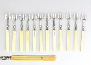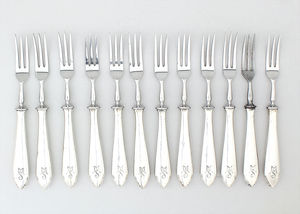 12 Kuchengabeln um 1910, Silber 800/000, gemarkt: WTB ( Wilhelm Binder) ,Monogramm: MS, (alle vorderen Gabelzinken bis auf eine ausgetauscht), L = 15,5 cm