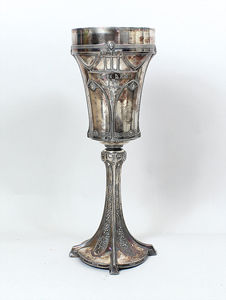 Pokal, JUGENDSTIL, WMF 1907, Metall versilbert, Punze: B WMF I/O OX, innen teilw. mit Feuervergoldung, Gravur: Gau 17A D.R.B.; 1 PR.; Schulreigen; 2.6.07, Kelch mit Fuß verschraubt, H = 32,5 cm