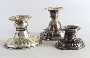 Lot: 3 Kerzenständer 1.Hälfte 20.Jhd., 2 x Silber 800/00, 1 x Silber 835/000, H = 38mm, 60 mm u. 68 mm, 1 Fuß Kitt gefüllt