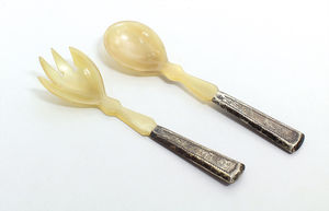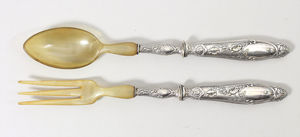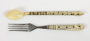 Reisebesteck 1. Hälfte 19. Jhd., Löffel aus Bein mit Metalleinlagen, Gabelgriff aus Bein, vorderer Teil mit Silbertauschierung, L = 17 cm