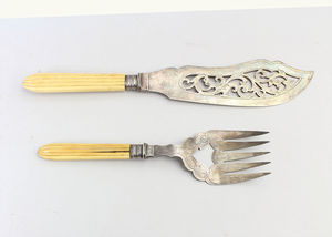 Fischtranchierbesteck um 1900, versilbert, gerillte Elfenbeingriffe, Klinge und Heber durchbrochen und graviert, L = 24 u. 32 cm