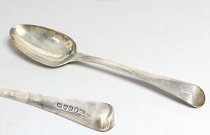 Löffel, ENGLAND LONDON 1788/89, RICHARD CROSSLEY (Spoonmaker), Silber 925/000, Gravur: an einer Kette hängender Schlüssel wird von einer Hand umschlossen, L = 22,3 cm, 76 g
