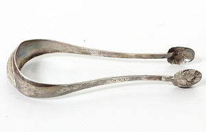 Zuckerzange um 1790/1800, Silber, wohl 13 Lot mit Stadtmarke (Regensburg ?), Gepunzt: F H R, fein trembliert u. graviert, L = 14 cm