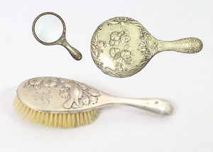 Lot: Spiegel & Bürste, JUGENDSTIL, Spiegel, EP plated, Engelmotiv, original Spiegel, D = 15,5 cm, Spiegel ist seitlich aufgeplatzt; Bürste, schwedisch, Silber gepunzt: THUNE 830/000, Naturborsten, Deckfläche mit Monogramm: A, L = 22,5 cm