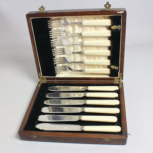 Fischbesteck für 6 Personen, ENGLAND um 1900, sig. EP PN NS, Griffe aus Kunststoff (Elfenbeinimitat) , L = 17,3 - 19,5 cm, innen mit Samt und Stoff ausgeschlagen, original Mahagoni Schatulle