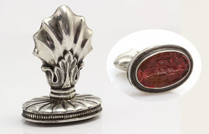 Pettschaft, Mitte 19. Jhd., Silber, Carneolsiegel mit HYGIEIA (Göttin der Gesundheit), schön ausgearbeitetes Akanthusblatt, H = 38 mm