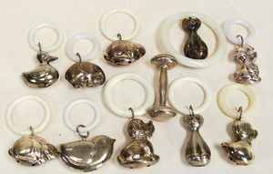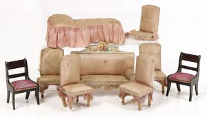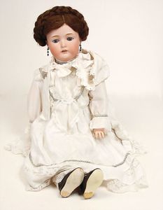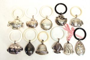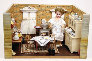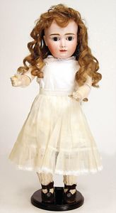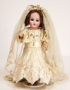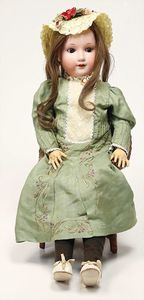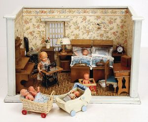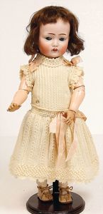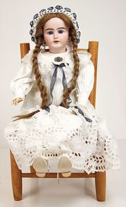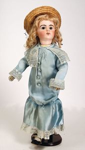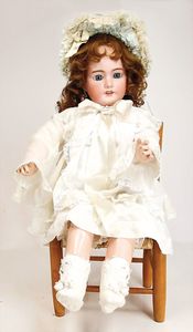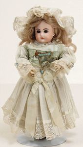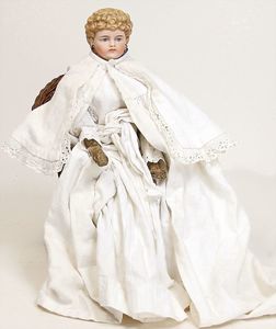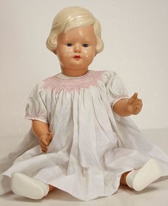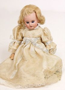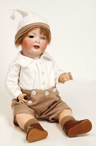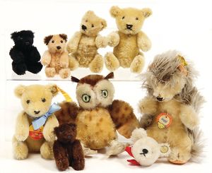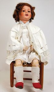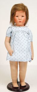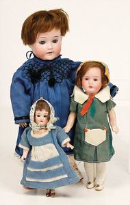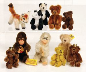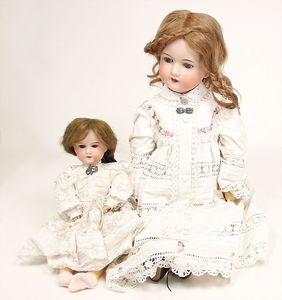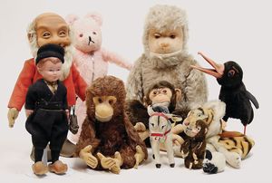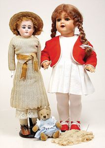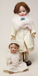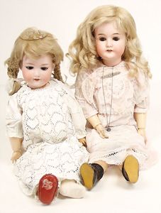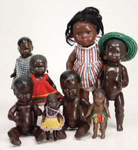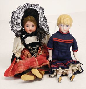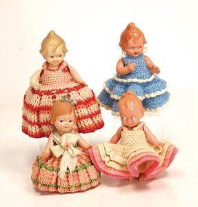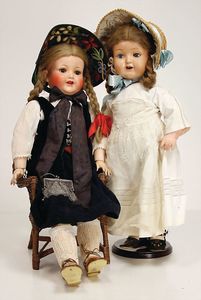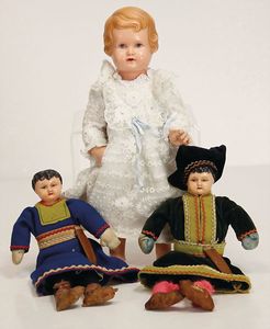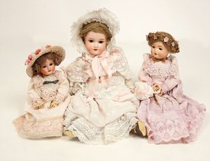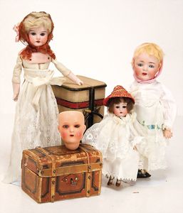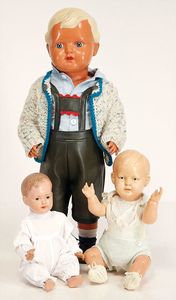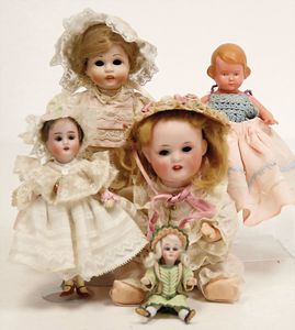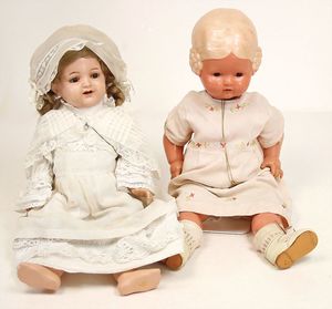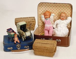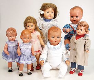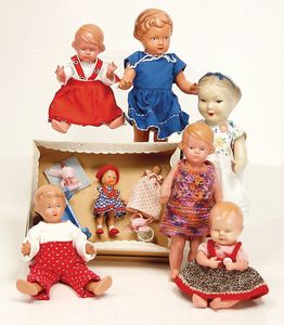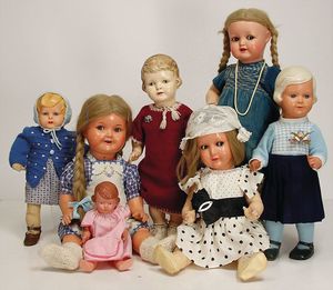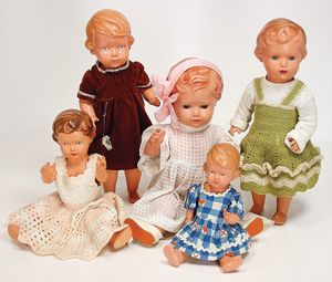 schönes Konv. Celluloid-Puppen, meist Schildkröt, darunter Inge, gemarkt 34, auf altem Masse-Toddlerkörper, bespielt, 1 Finger weggebrochen, 36 cm, Brustblattkopf-Puppe, gemarkt 11, auf Stoffkörper, Celluloid-Arme, 42 cm, 3x Cellba, fester Kopf, gemarkt 19 1/2, 2x 29, 1x König u. Wernicke für Schildkröt, gemarkt 298/5, Kopf Miblu, blaue Schlafaugen, off. Mund, Zähne, Riss am linken Auge, auf Masse-Stehbabykörper, 33 cm, 1x Kämmer u. Reinhard, gemarkt 728/8, blaue fest eingesetzte Glasaugen, off. Mund, Zähne, Echthaarperücke, Celluloid-Sitzbabykörper, mit leicht abstehendem Zeh, 45 cm