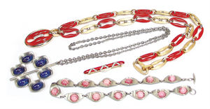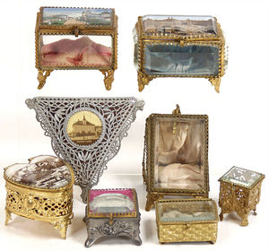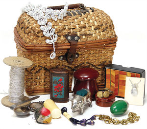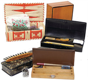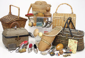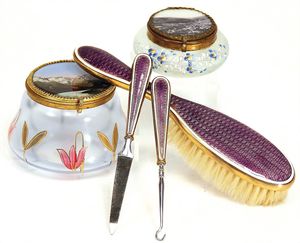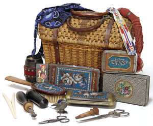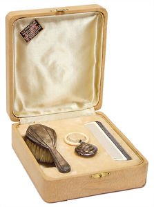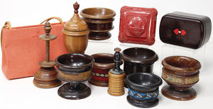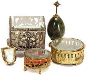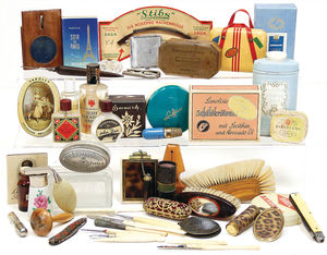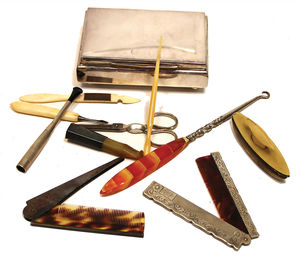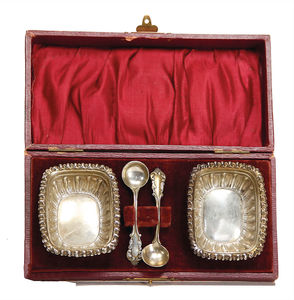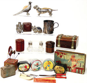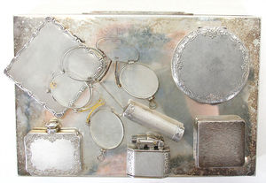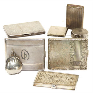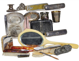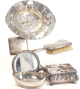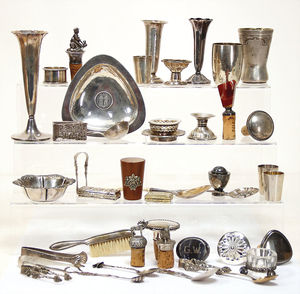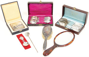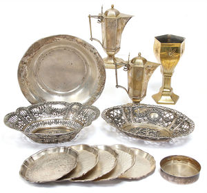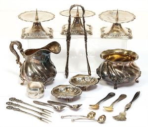 Konv. Silberartikel, frühes ausgefallenes Milchkännchen, gemarkt: 835, seitl. Drache, H: 7 cm, dazu passende Zuckerschale, H: 5 cm, Durchm.: 7 cm, gestempelt: 835, seitl. Drache, dazu 6 kl. Früchtegabeln, Zuckerlöffel, sowie Salzlöffel, 1 gr. Zuckerzange, 2 muschelförmige Salzfässchen, gemarkt: 925 Lat-Mex, dazu 3 silberne Kerzenständer, gemarkt: Antico 800, Durchm.: 6 cm, ausgefallenes Konv.