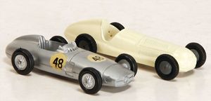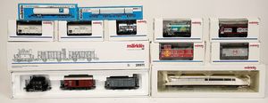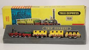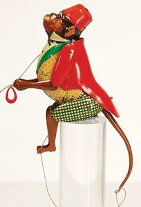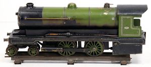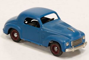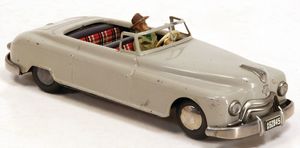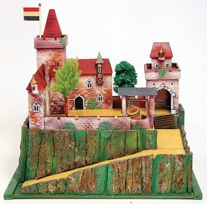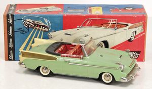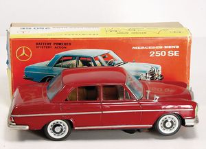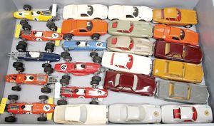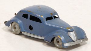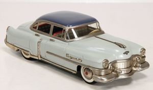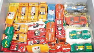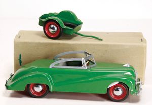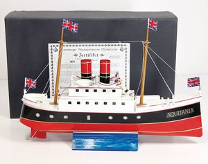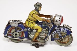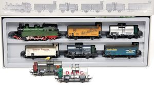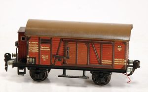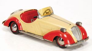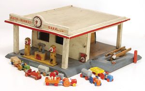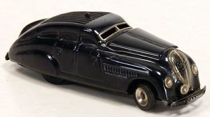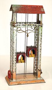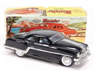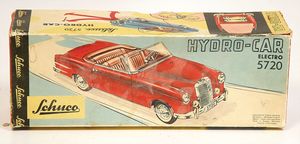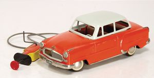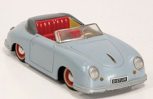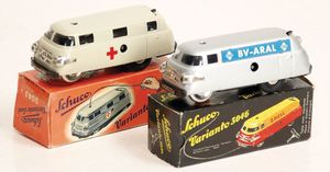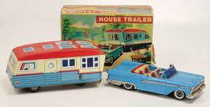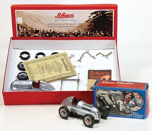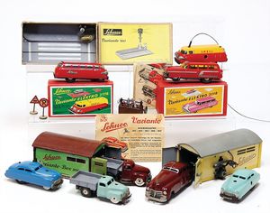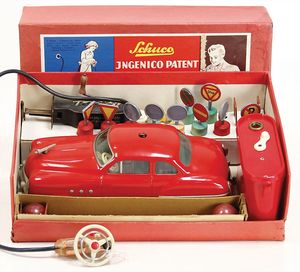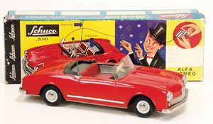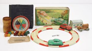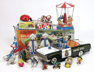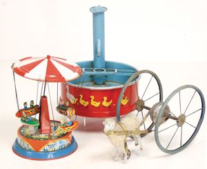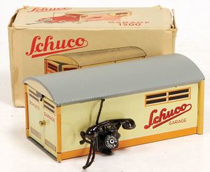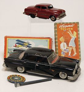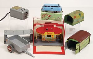 Fundkiste, Blechspielzeug, darunter Schuco, Fernlenkauto, Uhrwerk intakt, Verbindungskabel fehlt, im Orig.-Kart, 2 Brunnen, Höhe 17 u. 18 ,5 cm, altersbedingte Farbabplatzer, 3 Blech-Spardosen, 1 Dampfmaschinen-Antriebsmodell, Mann an Kreissäge, einige Köhler Figuren, Uhrwerke intakt, 1 Schuco Maus, kl. Blechgarage mit 2 Blechautos, Garagelänge 6,5 cm, u.a.