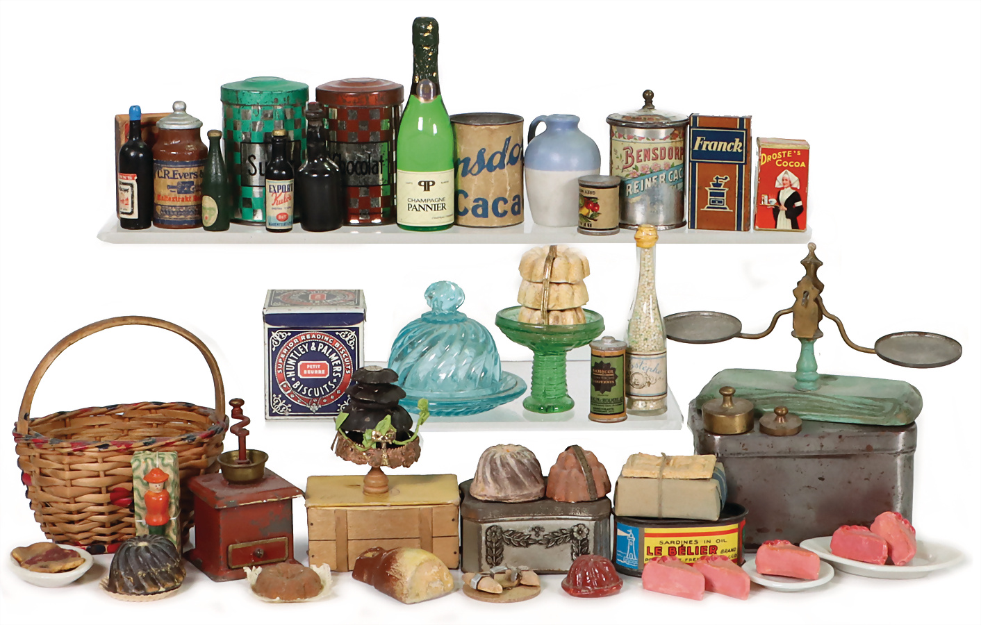 Konv. Puppenküchenteile, Bensdorp, Dose, Litho stark abgegriffen, kl. Kaffeemühle, Flaschen, Waage, Kleinteile, Provenienz: „Sammlung Frohnwieser“