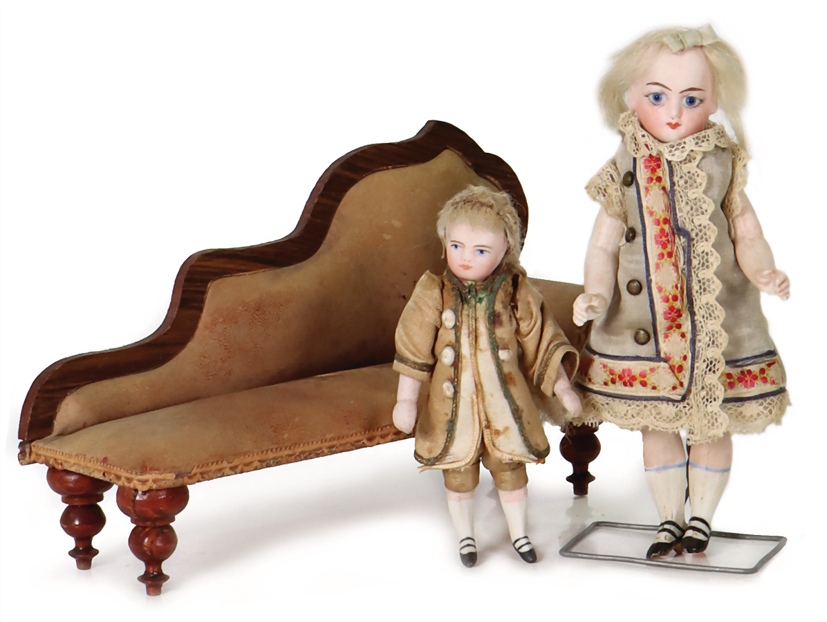 2 Teile, Puppenstuben-Puppen, Ganzbiskuit, 9,5 u. 14 cm, Kurbelkopf, 1x einges. Glasaugen, geschl. Mund, bewegl. Arme u. Beine, aufgemalte Schuhe u. Strümpfe, Ganzporzellan-Puppe, Kurbelkopf, gemalte Augen, bewegl. Arme u. Beine, sehr schöne Orig.-Kleidung, Recamière, Biedermeier, Provenienz: „Sammlung Frohnwieser“
