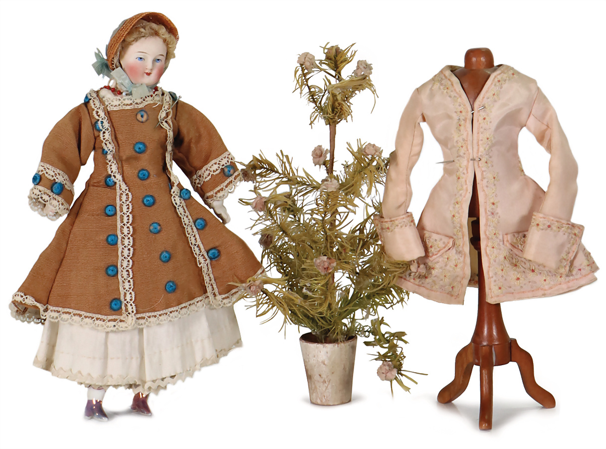 Puppenstuben-Puppe, 20 cm, Porzellan-Brustblattkopf, blaue gemalte Augen, Mohair-Perücke, Porzellan-Arme u. -Beine, aufgemalte Schuhe u. Strümpfe, Stoffkörper, schöne Orig.-Kleidung, kl. Kleiderbüste mit Kleid, 1 Federbaum, Provenienz: „Sammlung Frohnwieser“