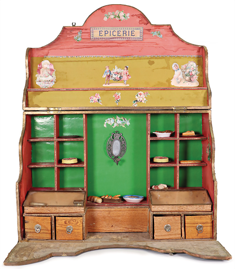 Epicerie Frankreich, aufklappbar, H: 69 cm, B: 47,5 cm, wenige Teile Zubehör, Provenienz: „Sammlung Frohnwieser“