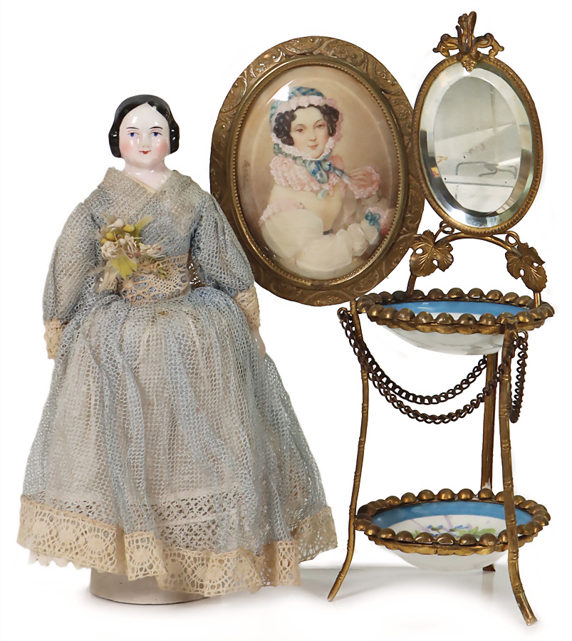 Brustblattkopf-Puppe, glasiertes Porzellan, 18,5 cm, fein ausmodell. Haare, glasierte Porzellan-Arme u. -Beine, flache Füße, Stoffkörper, Waschtisch mit Spiegel, Puppenstuben-Bild, kl. Aquarell, 10,5 cm, Provenienz: „Sammlung Frohnwieser“