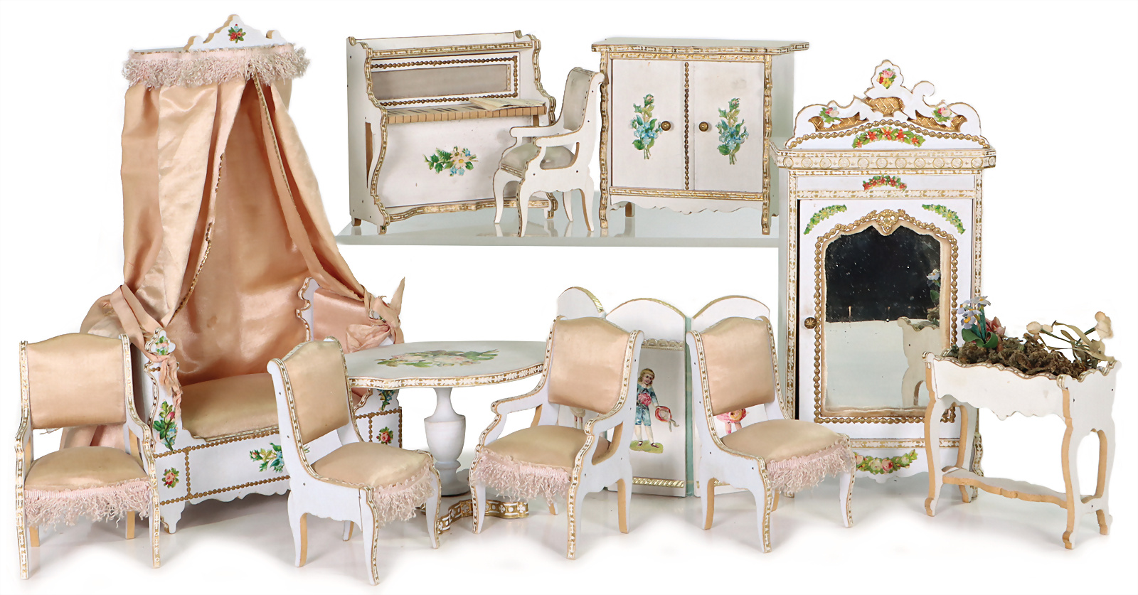 Puppenstuben-Möbelprogramm, Frankreich, für herrschaftl. Stube oder Reisepuppenstube, überbautes Sofa, H: 23,5 cm, Sitzgruppe, Tisch, Stühle, Schrank, Klavier, Paravent, Kommode, Provenienz: „Sammlung Frohnwieser“
