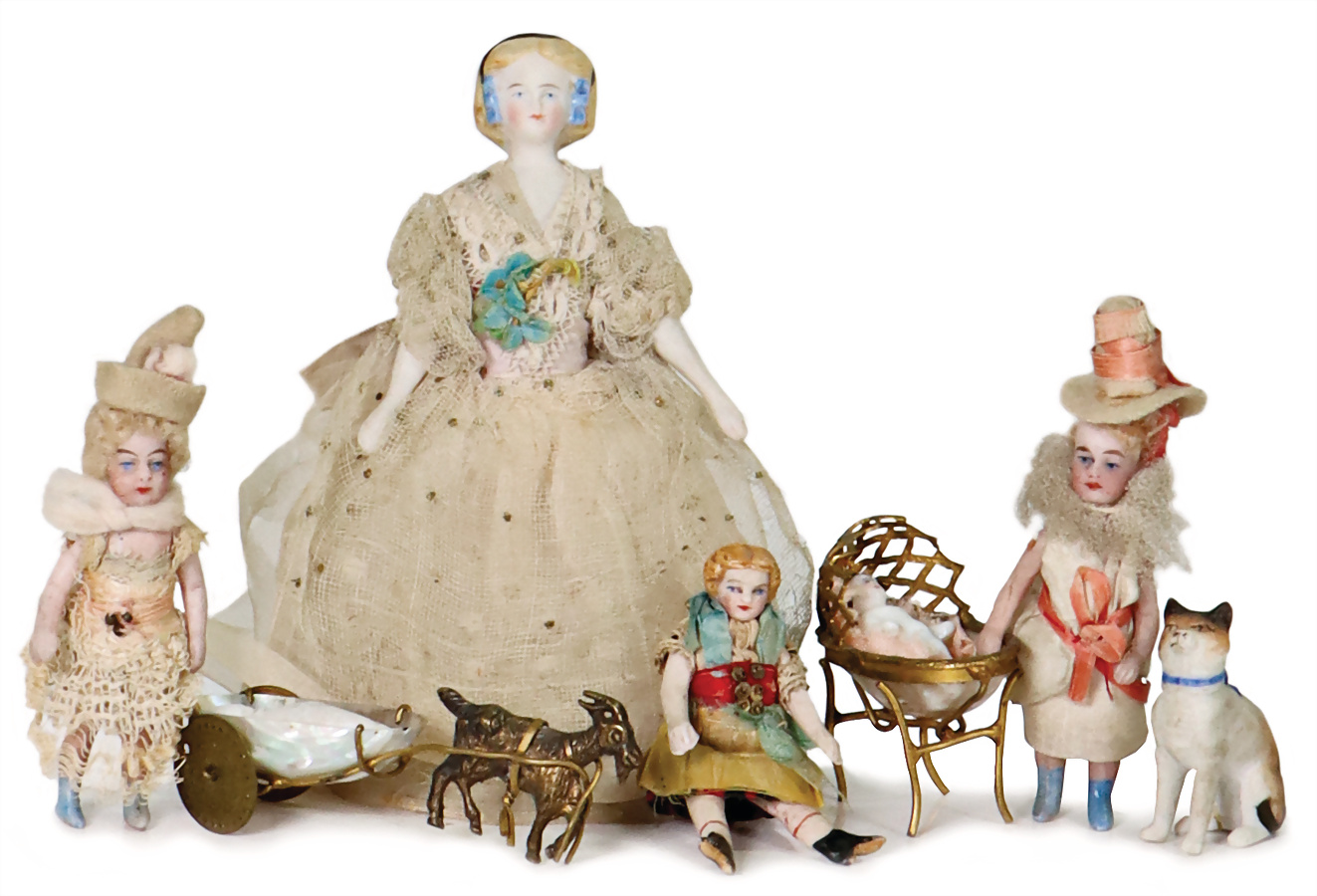 Puppenstuben-Puppe, Biedermeier, Porzellan-Brustblattkopf, 12,5 cm, ausmodell. Haare mit Haarnetz u. Haarband, Porzellan-Arme u. -Beine, flache Füße, Stoffkörper, Orig.-Kleidung, 3 kl. Ganzporzellan-Puppen, kl. Porzellan-Hund, Provenienz: „Sammlung Frohnwieser“