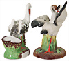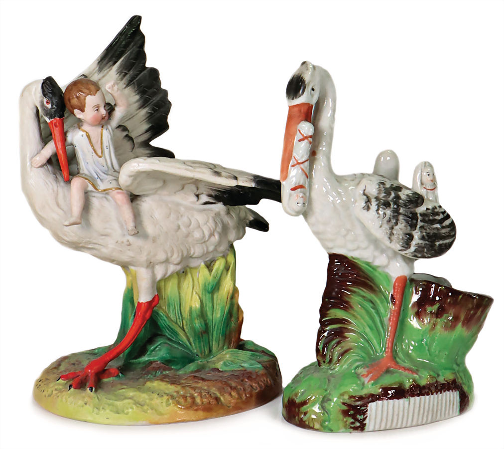 Konv. Porzellan-Figuren, Storch mit Babys, glasiertes Porzellan, 16 cm, Storch mit Kind auf dem Rücken, 16,5 cm, Provenienz: „Sammlung Frohnwieser“