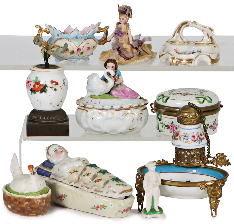 Konv. Porzellan, Dosen, Schreibzeug, Schalen, kl. Ganzporzellan-Figur, 1 Fatschenkind, Provenienz: „Sammlung Frohnwieser“