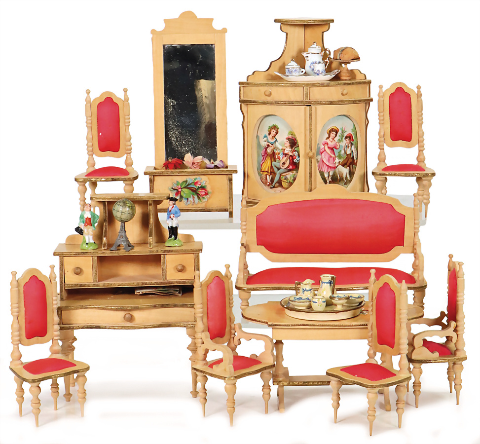 Puppenstuben-Möbel, Eckschrank mit liothogr. Bildern, H:15 cm, Sekretär, Spiegel, Sitzgruppe mit Sofa, einige Zubehörteile, Provenienz: „Sammlung Frohnwieser“