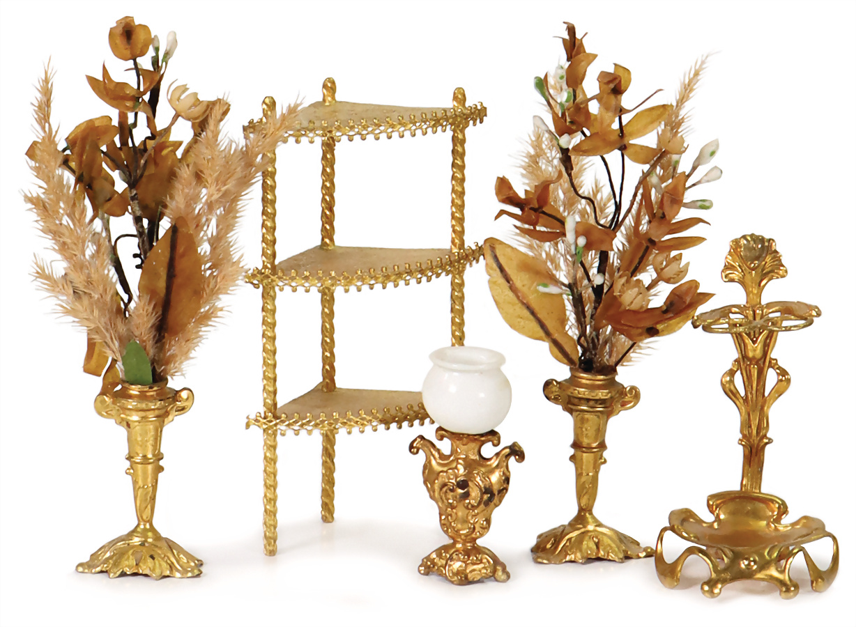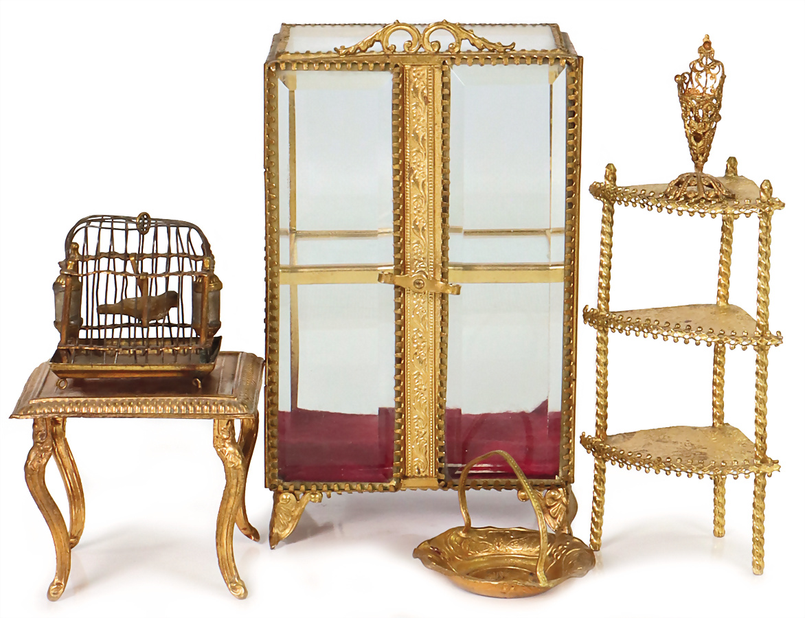 Puppenstuben-Ausschmückungsteile, Vitrine Messingblech vergoldet, Eckregal, Provenienz: „Sammlung Frohnwieser“