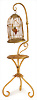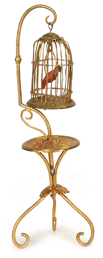 Messingblech vergoldet, Vogelkäfig mit Wachsvogel, mit Ständer, 18,5 cm, Provenienz: „Sammlung Frohnwieser“